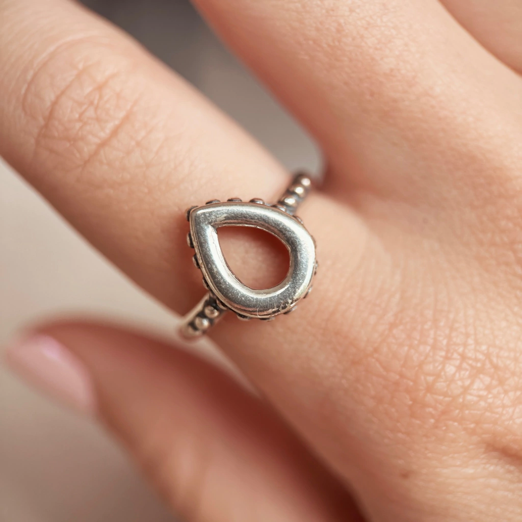 Anillo de plata 925 con forma de gota abierta y tallado en los costados. Es de plata inflada asi que es mas grueso que los anillos tradicionales.
