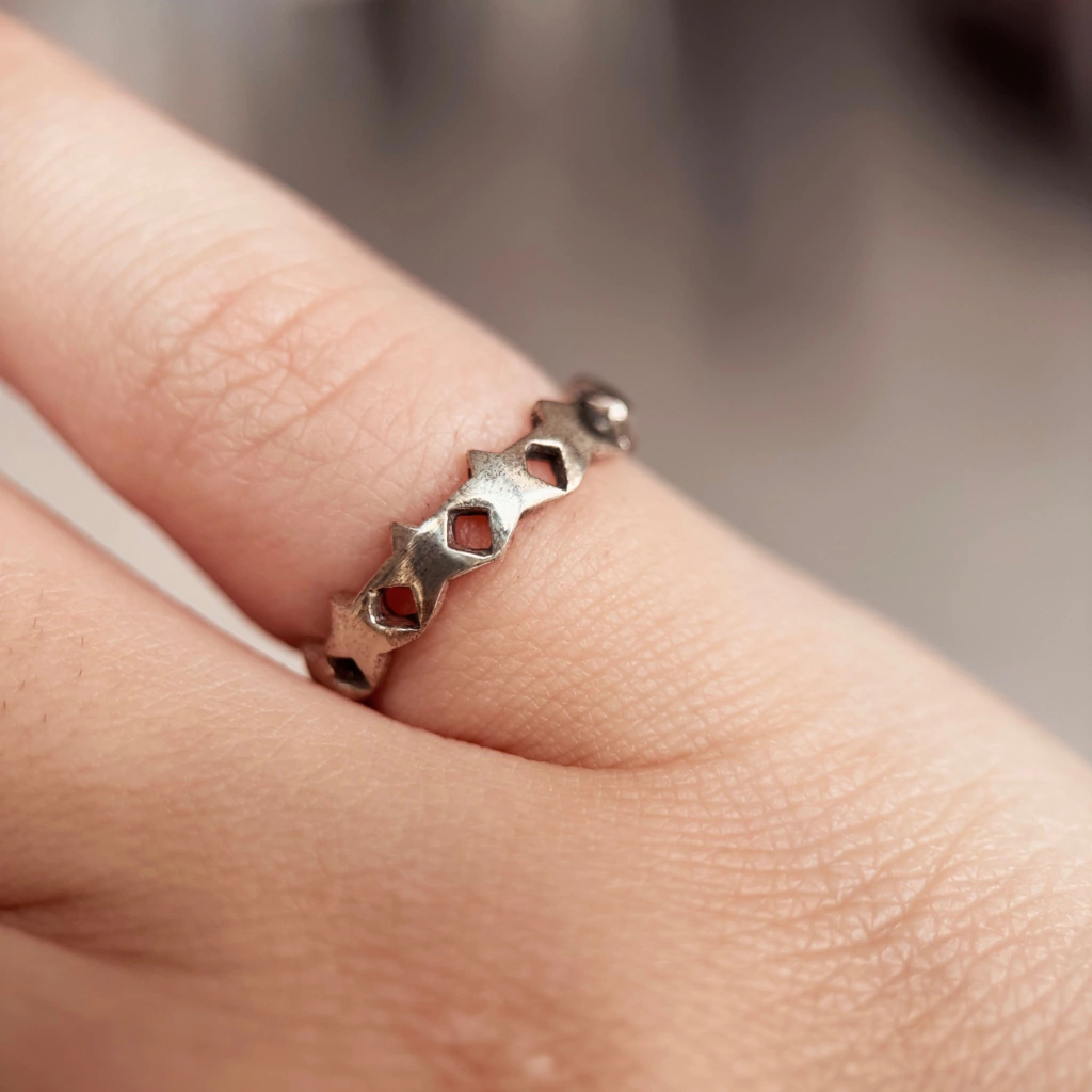 Kylie es un anillo de plata 925 compuesto por pequeñas estrellitas en todo su alrededor, no tiene una parte frontal, asi que no vas a tener que acomodártelo si se te da vuelta porque siempre va a estar perfecto.