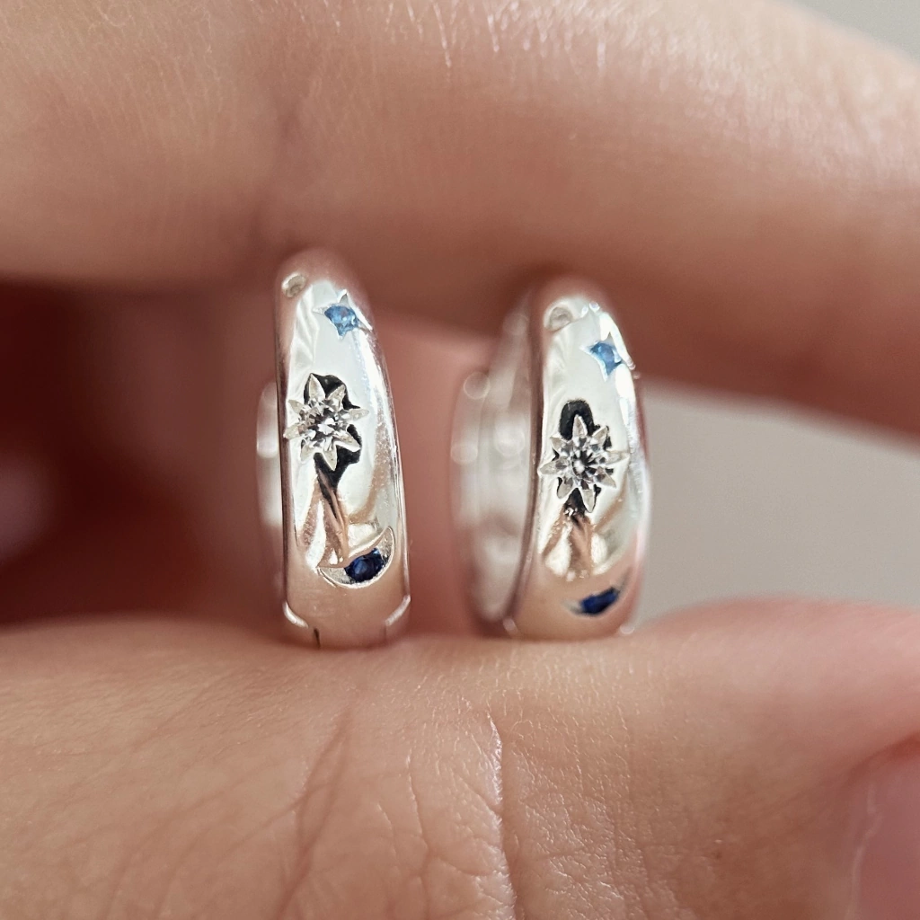 Argollas de plata 925 de 14mm de diametro, con forma de gota y dibujitos de lunas y estrellas con cubics engarzados color cristal y celestes/azules. Vienen por par.