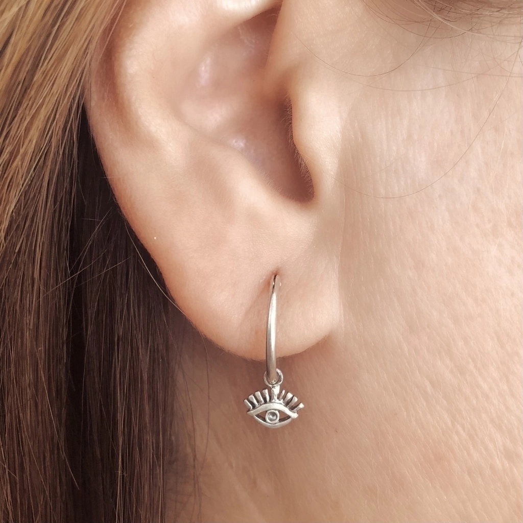 Argollas de plata 925 con dije de ojito protector colgante. El dije es desmontable de la argollita, por lo que vas a poder usarla con el dije como te moestramos en la foto o, si algún día estas para algo mas simple, le sacas el dije y te queda una argollita de 14mm.