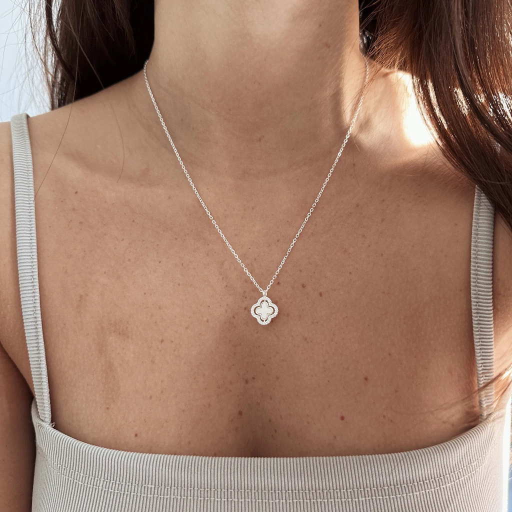 Collar de plata 925 con dije de flor en nacar con borde de flor de microcubics cristal.