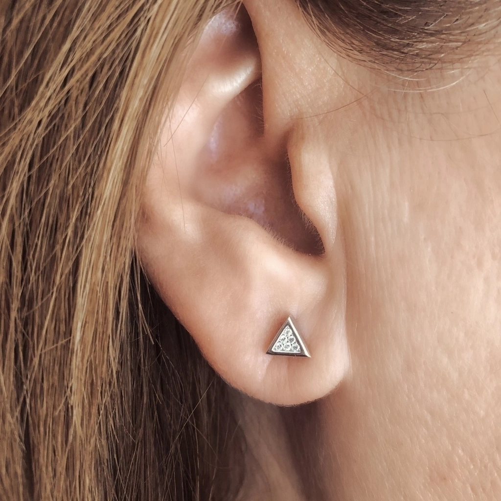 Aros miniatura de plata 925 en forma de triangulo con piedras brillantes.