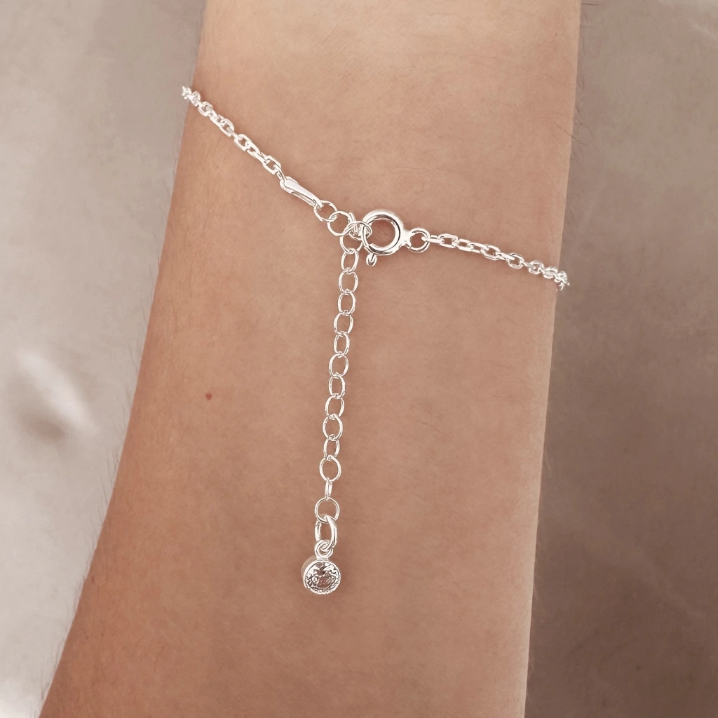 Daisy es una pulsera de plata 925 con una margarita de 1cm en el centro y cubics circulares de 4mm. La misma tiene una longitud de 17cm + 3cm de prolongador. Al final del prolongador tiene un dije de cubic circular de 4mm que le da un toque especial porque queda colgando como te mostramos en la foto.