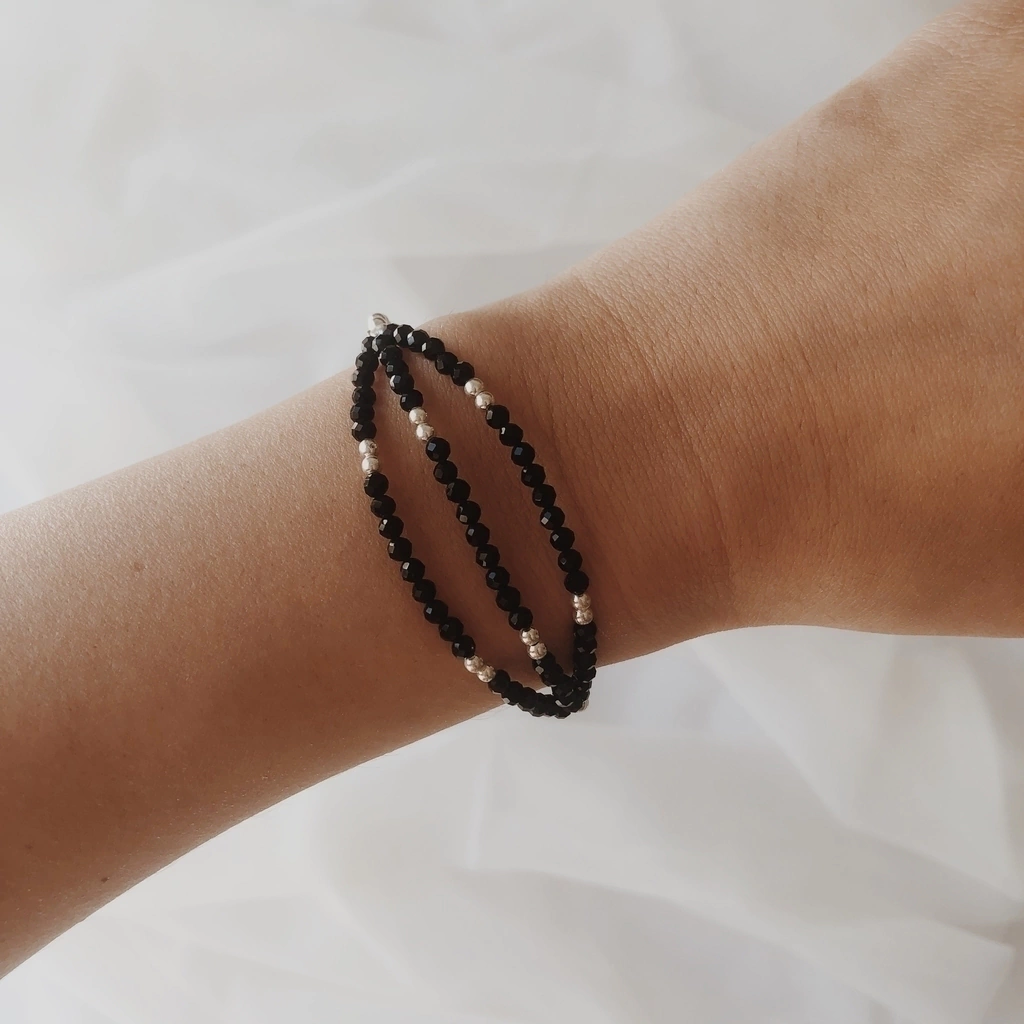 Es una pulsera de plata 925 combinada con cristales negros. Tiene una logitud de 17cm y es de cierre fijo, no regulable, asi que tenelo en cuenta antes de elegirla.